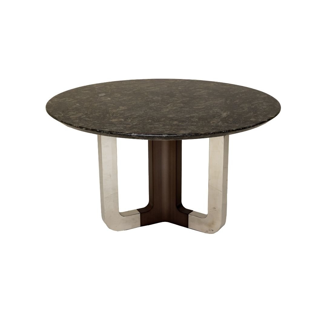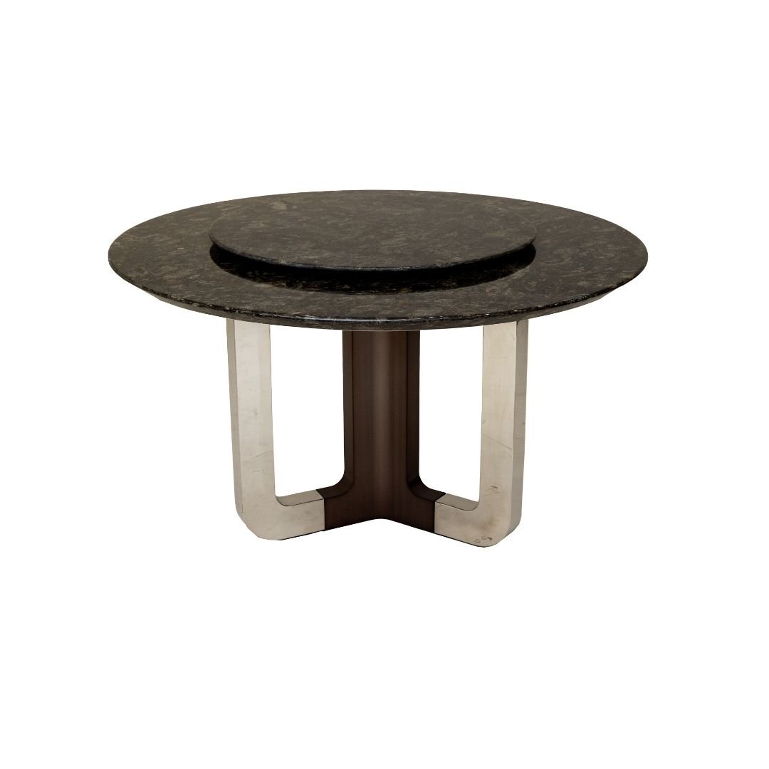 An eccentric round dining table. That comprises of a pristine beautifully carved white marble, on a wood and metal base. A harmony of robustness and delicacy, that will provide the most luxe dining experience.